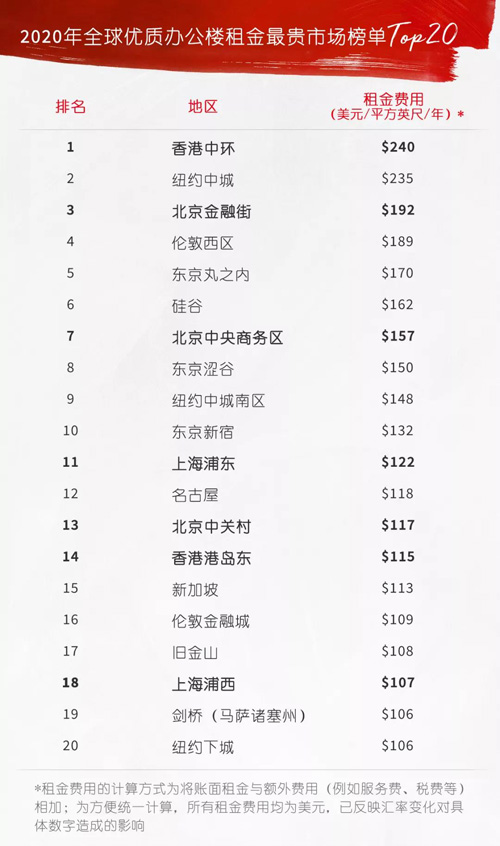 在仲量聯(lián)行2020年全球《優(yōu)質(zhì)辦公樓租金追蹤指數(shù)報(bào)告》中,全球最貴辦公樓市場租金也呈現(xiàn)整體下滑趨勢,平均降幅達(dá)3.0%,但各地區(qū)最貴辦公樓的租金差距有明顯縮小。香港中環(huán)地區(qū)、北京金融街和北京中央商務(wù)區(qū)依然位列十大最貴辦公樓市場。