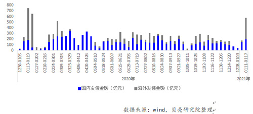 1月18日,據(jù)貝殼研究院統(tǒng)計(jì),按照發(fā)行日期,上周(2021.01.11-01.17)房企境內(nèi)外債券共發(fā)行35筆,較上周增加19筆,融資(含計(jì)劃)金額約578.8億元,融資金額環(huán)比增長(zhǎng)227.2%。
