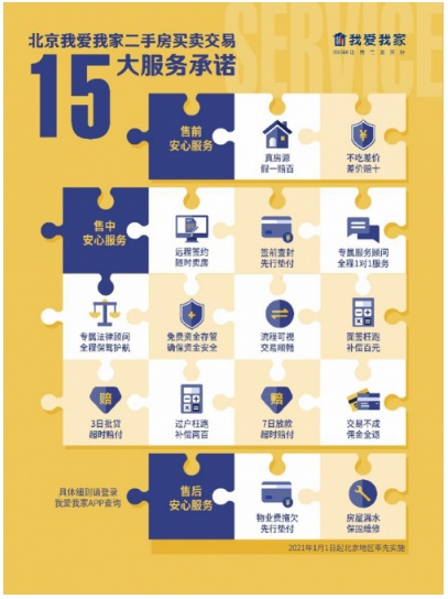 2021年伊始,北京我愛我家推出“十五大服務(wù)承諾”,進(jìn)一步實(shí)現(xiàn)對(duì)二手房買賣交易全流程覆蓋,從售前的房源保真到售中階段的資金安全、履約跟蹤、法律顧問、時(shí)效管理、隨時(shí)隨地交易,再到售后的欠費(fèi)墊付、房屋質(zhì)量保障,真正體現(xiàn)了為客戶安全、高效、便捷的購(gòu)房體驗(yàn)360度護(hù)航。北京我愛我家成為房地產(chǎn)經(jīng)紀(jì)行業(yè)中服務(wù)項(xiàng)目最全,服務(wù)標(biāo)準(zhǔn)最高的標(biāo)桿型企業(yè)。