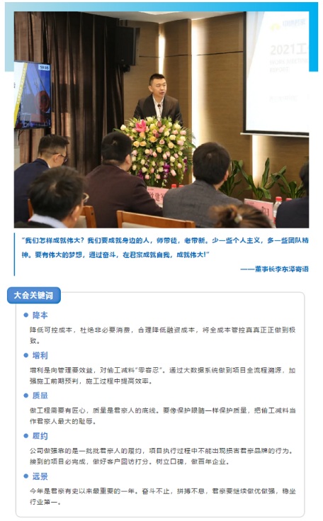 最后,會(huì)議號(hào)召,2021年,全體君豪人要緊扣公司戰(zhàn)略方向,以年度目標(biāo)為行動(dòng)的燈塔,以“精質(zhì)量·節(jié)成本·增效益”為具體方針,深耕業(yè)務(wù),強(qiáng)練內(nèi)功,繼續(xù)在行業(yè)中做強(qiáng)做優(yōu),努力實(shí)現(xiàn)更高質(zhì)量、更有效率、更加健康的發(fā)展!