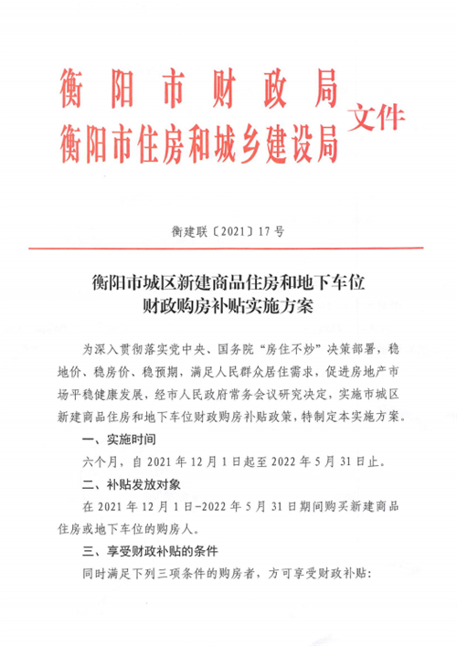 湖南省衡陽市住房和城鄉(xiāng)建設(shè)局、衡陽市財(cái)政局12月10日聯(lián)合發(fā)布《衡陽市城區(qū)新建商品住房和地下車位財(cái)政購房補(bǔ)貼實(shí)施方案》。