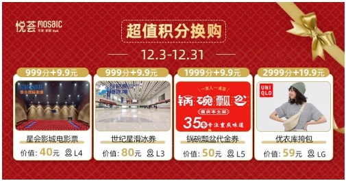 此次積分兌禮還推出了用積分加現(xiàn)金換購禮品的形式,用積分抵扣以后,僅需9.9元就可以兌換星會(huì)影城電影票、世紀(jì)星滑冰券、優(yōu)衣庫挎包等禮品,積分換購活動(dòng)一經(jīng)推出就大受歡迎,將12月積分兌禮活動(dòng)推向了高潮,給消費(fèi)者帶來全新的驚喜換購和優(yōu)惠體驗(yàn)。