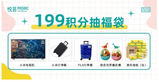 除此之外,更讓人驚喜的還有199積分抽取幸運(yùn)福袋,百分之百中獎(jiǎng),小米電視、FILA行李箱、餐飲代金券、優(yōu)衣庫挎包等超多好禮,給各位會(huì)員帶來更多驚喜,也在歡樂購物之余平添了一絲神秘的色彩。