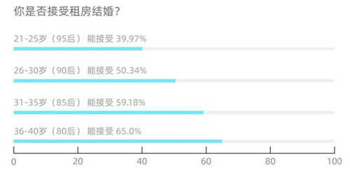 《報告》顯示,54%左右的受訪者拒絕租房結(jié)婚,從年齡來看,80后到95后做出這一選擇的比例依次遞增,說明越年輕的群體越難接受租房結(jié)婚。此外,根據(jù)貝殼研究院此前的調(diào)查,接受租房結(jié)婚的90后獨居青年中,66%的人認(rèn)為“可暫時性租房,未來需要有自己的房子”。買房的時間范圍可放寬,但結(jié)婚買房這件事不能妥協(xié)。