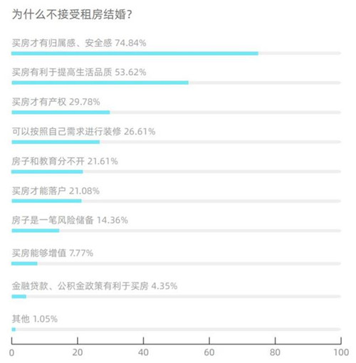 《報告》顯示,不支持租房結(jié)婚的受訪者里,75%的人認(rèn)為,買房才有歸屬感、安全感,且超半數(shù)人認(rèn)可“買房后有利于提高生活品質(zhì)”這一觀點。不再頻繁搬家、隨意地裝修布置、孩子和熟悉的朋友玩耍,這或許就是穩(wěn)定居所帶來的平凡但美滿的生活。