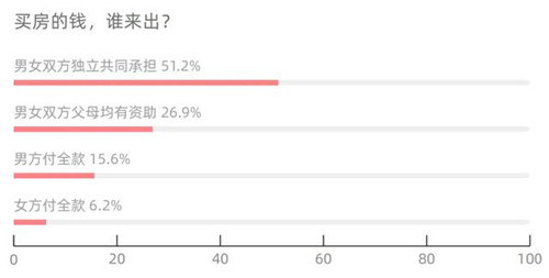 調(diào)研中,51%的受訪者表示,買房資金由男女雙方獨立、共同承擔(dān),其次,30%的人表示部分資金源于雙方父母資助。同時,大多數(shù)人認(rèn)為房子是共同財產(chǎn),“不管誰出錢,房產(chǎn)證上都要寫上夫妻雙方的姓名”,這一選項占比最高達(dá)到55%左右。可見,過去在婚姻中“男尊女卑”的觀念在減少,取而代之的是自由平等的關(guān)系。
