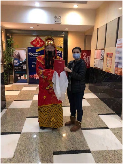 世茂服務的工作人員穿上財神的服裝,為業(yè)主們派送新春福袋,將福氣和財氣送到每家每戶!昂荛_心啊,世茂服務一直以來都很貼心,這份福袋里的紅包我們很喜歡,給小輩包紅包最好了”業(yè)主李女士贊嘆。