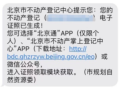 “北京市不動產(chǎn)登記中心提醒您:您的不動產(chǎn)電子登記證照已生成!”自唐先生18日提交了繳稅預(yù)審申請后,到25日,就正式收到不動產(chǎn)電子登記證照,僅僅用了5個工作日。此單也是北京我愛我家完成的首個“全程網(wǎng)辦”的房產(chǎn)交易單。