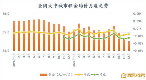 據(jù)諸葛找房數(shù)據(jù)研究中心監(jiān)測數(shù)據(jù),2020年12月,全國大中城市租金掛牌均價為34.53元/平方米/月,環(huán)比下降0.5%,同比下降1.47%,環(huán)比降幅較上月收窄0.2個百分點。全國大中城市租金均價波動下滑,10月份以來租賃市場進入傳統(tǒng)的行業(yè)淡季,疊加疫情的影響尚未完全消散,租賃市場持續(xù)低溫表現(xiàn),12月租金下滑至兩年內(nèi)最低水平。