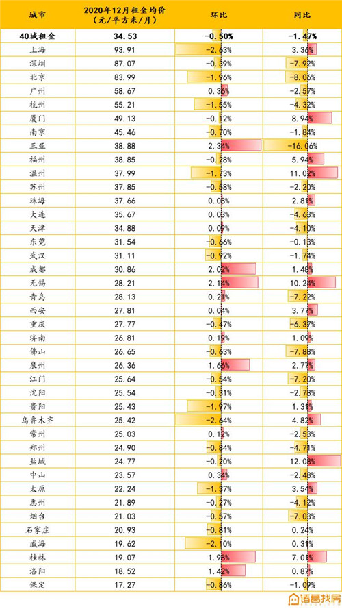 日前,諸葛找房數(shù)據(jù)研究中心發(fā)布《2020年12月全國大中城市租金均價報告》(以下簡稱《報告》),《報告》指出,2020年12月,全國大中城市12月租金下滑至兩年內(nèi)最低水平。三亞12月租金環(huán)比漲幅最高,烏魯木齊環(huán)比跌幅最大。