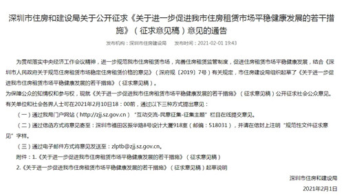 據(jù)“深圳發(fā)布”微信號消息,為進(jìn)一步規(guī)范住房租賃市場行為,深圳市住建局2月1日發(fā)布《關(guān)于進(jìn)一步促進(jìn)我市住房租賃市場平穩(wěn)健康發(fā)展的若干措施》(征求意見稿)(簡稱《若干措施》)。《若干措施》提到,深圳將大力推進(jìn)公共服務(wù)均等化,逐步推進(jìn)租房積分入戶政策與購房享受同等待遇,優(yōu)化租房積分入學(xué)政策。