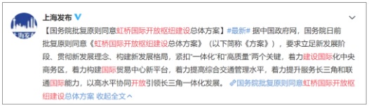 2021年2月18日,國務(wù)院發(fā)布關(guān)于同意《虹橋國際開放樞紐建設(shè)總體方案》的批復(fù),引爆微博: