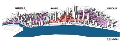 兩片:即西部虹口港活力片區(qū)與東部提籃橋片區(qū)(為低層高密度空間格局)