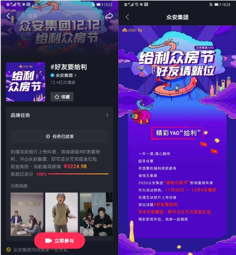 以多頻曝光、全民互動、裂變傳播等為特色的抖音全民任務(wù),正在成為房企搭乘數(shù)字營銷快車、制造行業(yè)級營銷大事件的標(biāo)配。為了在活動前期快速引發(fā)公眾對“眾安1212給利眾房節(jié)”的注意力,眾安集團(tuán)在抖音發(fā)起全民任務(wù)#好友要給利 ,邀請抖音用戶曬出與好友的“給力瞬間”,一起瓜分眾安集團(tuán)送出的萬元紅包現(xiàn)金獎勵。