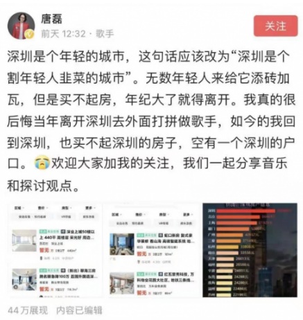 就連歌手唐磊都吐槽深圳房?jī)r(jià),還上了熱搜:“我真的很后悔當(dāng)年離開(kāi)深圳去外面打拼做歌手,如今的我回到深圳也買不起深圳的房子,空有一個(gè)深圳戶口!