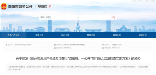 房訊網(wǎng)訊 3月29日,鄭州市住房保障和房地產(chǎn)管理局印發(fā)《鄭州市房地產(chǎn)領(lǐng)域?qū)m?xiàng)整治“雙隨機(jī)、一公開”部門聯(lián)合監(jiān)督檢查實(shí)施方案》,明確在3月29日至2021年4月30日期間,對房地產(chǎn)開發(fā)企業(yè)、經(jīng)紀(jì)機(jī)構(gòu)、租賃企業(yè)和評估公司進(jìn)行檢查,規(guī)范企業(yè)經(jīng)營行為。