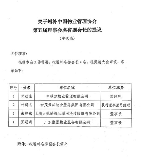 值得一提的是,世茂天成物業(yè)服務(wù)集團(tuán)有限公司執(zhí)行董事兼總經(jīng)理葉明杰增補(bǔ)成為第五屆理事會(huì)名譽(yù)副會(huì)長(zhǎng)。