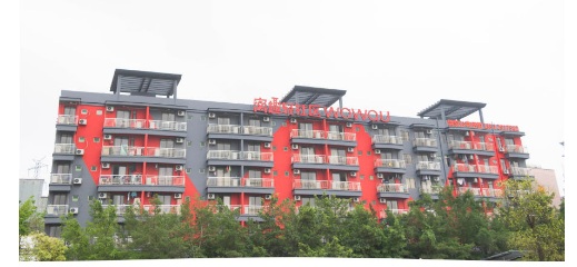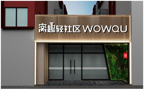 樓頂【窩趣輕社區(qū)WOWQU】紅色LED大字,紅色也深灰色外墻突出“W”的品牌識別元素