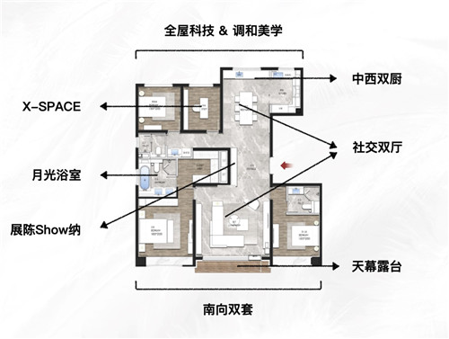正如張程總在介紹「盡興195」時引出的新Keyword:"設計向后 生活向前"。在參觀樣板間過程中,大家也看到「盡興195」戶型的盡興設計觀:它包含東叁最盡興的9大場景,即社交雙廳、中西雙廚、南向雙套、天幕露臺、月光浴室、X-Space、展陳Show納、全屋科技與調和美學。