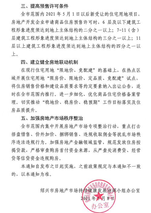 房訊網(wǎng)訊 5月8日,浙江省紹興市房地產(chǎn)市場持續(xù)健康發(fā)展協(xié)調(diào)小組辦公室印發(fā)《關(guān)于進(jìn)一步促進(jìn)紹興市房地產(chǎn)市場平穩(wěn)健康發(fā)展的通知》,從切實加大住宅用地供應(yīng)、試行公證搖號公開銷售、提高預(yù)售許可條件、建立健全房地聯(lián)動機(jī)制、加強(qiáng)房地產(chǎn)秩序整治等方面促進(jìn)房地產(chǎn)市場平穩(wěn)健康發(fā)展。