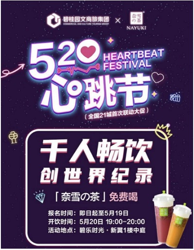 隨著“后浪”崛起,“Z世代”青年逐漸成為商業(yè)消費市場的主力軍。隨之而來的,是“顏值即正義”、“粉絲效應”、“網紅經濟”等新興消費趨勢。緊抓這一趨勢,碧桂園文商旅于此次心跳節(jié)探索“網紅營銷”,跨界網紅茶飲品牌 —— 奈雪的茶,推出“千人同飲奈雪”活動,并將嘗試申請史上最多人同飲奶茶的世界紀錄,展示了碧桂園文商旅在跨界營銷和聚焦年輕流量方面的突破式創(chuàng)新。