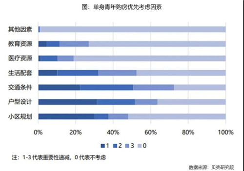 值得關(guān)注的是,單身青年偏愛(ài)新房、小戶型。調(diào)研顯示,僅14.68%的單身青年傾向二手房,占比明顯低于戀愛(ài)或已婚狀態(tài)的21.6%和20.19%。購(gòu)房理想面積80平方米以下的單身青年占比28.96%,超過(guò)已婚青年群體占比。此外,單身青年較為看重房屋周邊交通條件,戶型設(shè)計(jì)、生活配套及小區(qū)規(guī)劃,相對(duì)而言,教育、醫(yī)療資源對(duì)購(gòu)房意愿影響較小。