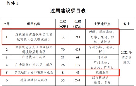 另一條城際鐵路——深惠城際,根據(jù)去年國(guó)家發(fā)改委批復(fù)文件,已被列為近期建設(shè)項(xiàng)目,2022年前啟動(dòng)建設(shè)。