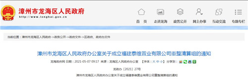 房訊網(wǎng)訊 5月7日,福建省漳州市龍海區(qū)人民政府辦公室發(fā)出通知,成立工作組,對(duì)泰禾集團(tuán)旗下福建泰維置業(yè)有限公司重整清算。