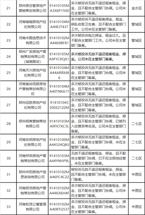 上述33家房企存在“無故克扣租客租金、押金;租賃合同使用不規(guī)范、簽訂的租賃合同不備案;從業(yè)主體未在主管部門備案;拖欠租金、押金后無法取得聯(lián)系”等行為。