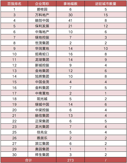 CRIC數(shù)據(jù)顯示,TOP30房企在20個城市中共拿下273幅含住宅的地塊,占全部地塊的比重超四成。具體到房企而言,頭部房企表現(xiàn)尤為突出。其中,融創(chuàng)拿地總量已達(dá)到41幅,萬科和保利拿地總量也均超過20幅。而30強中排名靠后的房企拿地數(shù)量多為個位數(shù)。
