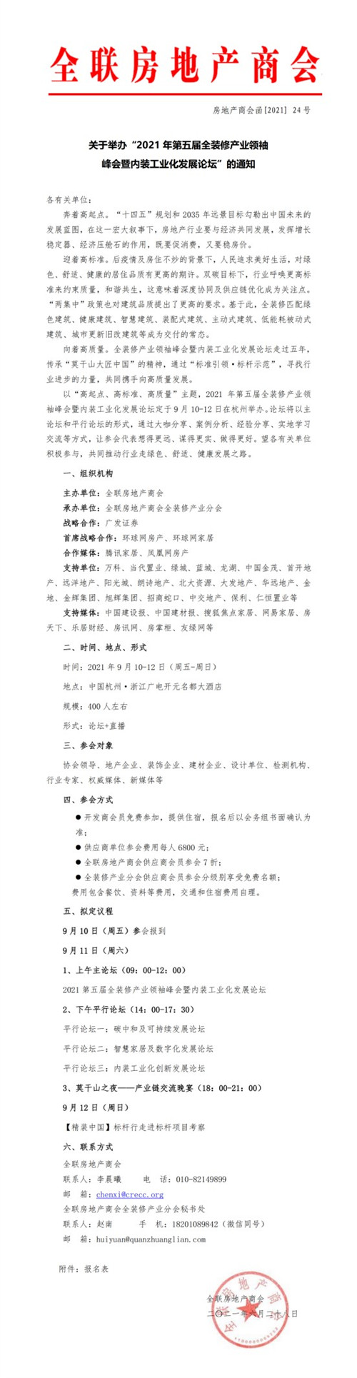 "十四五"開(kāi)局之年,從雙碳大考,到"兩集中供地"對(duì)住宅的要求升級(jí)等,使全裝修產(chǎn)業(yè)面臨著高品質(zhì)發(fā)展的新課題。在此背景下,由全聯(lián)房地產(chǎn)商會(huì)主辦,全聯(lián)房地產(chǎn)商會(huì)全裝修產(chǎn)業(yè)分會(huì)承辦的"2021第五屆全裝修產(chǎn)業(yè)領(lǐng)袖峰會(huì)暨內(nèi)裝工業(yè)化發(fā)展論壇",將于9月在杭州盛大舉辦,邀請(qǐng)政策智囊、專(zhuān)家學(xué)者、房企大咖、建材部品企業(yè)等產(chǎn)業(yè)鏈有識(shí)之士年度聚首,智慧碰撞,共話(huà)"高起點(diǎn) 高標(biāo)準(zhǔn) 高質(zhì)量",為新挑戰(zhàn)書(shū)寫(xiě)新"答卷"!