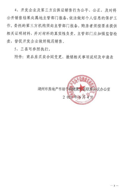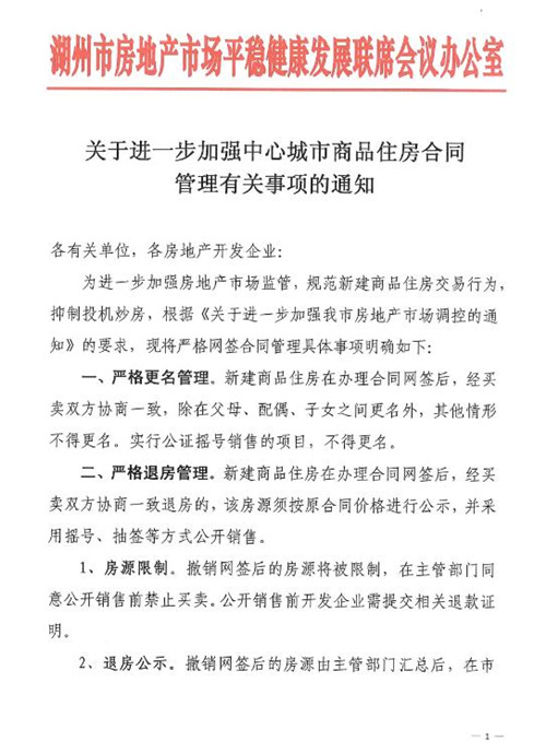 房訊網(wǎng)訊 6月4日,浙江省湖州市住房和城鄉(xiāng)建設(shè)局發(fā)布《關(guān)于進一步加強中心城市商品住房合同管理有關(guān)事項的通知》。《通知》明確,新建商品住房在辦理合同網(wǎng)簽后,經(jīng)買賣雙方協(xié)商一致,除在父母、配偶、子女之間更名外,其他情形不得更名。實行公證搖號銷售的項目,不得更名。