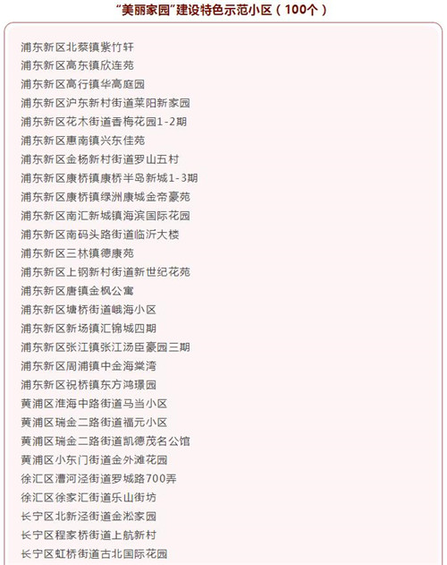 房訊網(wǎng)訊 據(jù)上海市房管局消息,經(jīng)過市房管局初選以及專家評選,共評選出100個“美麗家園”建設(shè)特色示范小區(qū),并于6月7日起進(jìn)行公示,公示期為6月7日—6月11日。