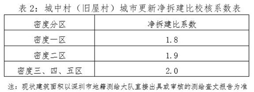 經(jīng)批準列入城市更新單元計劃的城中村改造項目(城中村、舊屋村合法用地占項目拆除范圍用地的比例應不低于50%),在現(xiàn)行政策基礎上可綜合考慮住房回遷、項目可實施性等因素,按照表2校核城市更新單元規(guī)劃容積,且不需另行配建公共住房。