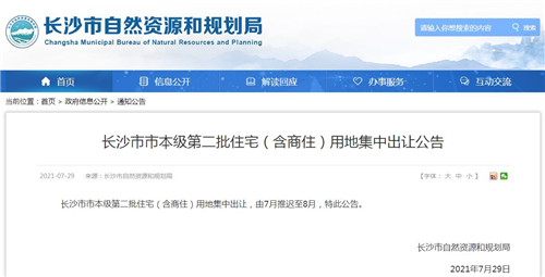 房訊網(wǎng)訊 7月29日,長沙市自然資源和規(guī)劃局發(fā)布公告,長沙市市本級第二批住宅(含商。┯玫丶谐鲎,由7月推遲至8月。
