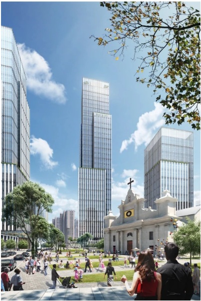 綠地外灘中心地處上海歷史人文中軸東端,位于董家渡板塊,而“董家渡”正是根植于上海人記憶里的城市印象。因此,項(xiàng)目保留董家渡的文化特色,重新修葺古建筑商船會(huì)館、天主教堂,打造外灘歷史文化地標(biāo)。