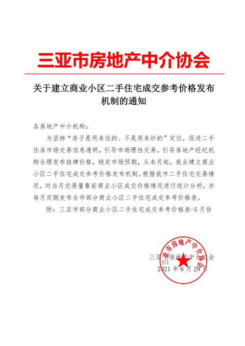 三亞市房地產(chǎn)中介協(xié)會(huì)于6月29日發(fā)布《關(guān)于建立商業(yè)小區(qū)二手住宅成交參考價(jià)格發(fā)布機(jī)制的通知》。