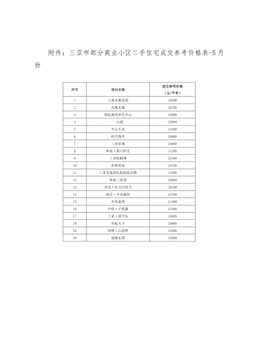 當(dāng)日,三亞市房地產(chǎn)中介協(xié)會(huì)發(fā)布了5月份三亞市部分商業(yè)小區(qū)二手住宅成交參考價(jià)格表,共涉及20個(gè)小區(qū)。