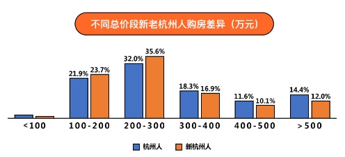 同時,已購房的新杭州人整體呈現(xiàn)年輕化特征,21-30歲之間購房占比最多,占比達到 62.4%,新一代的年輕人買房意識更加超前,當然買房時間提前了,購買力方面就要“縮減”一些。新杭州人購房支付力以300萬為分水嶺,高于300萬以上,購房比例低于杭州人,低于300萬則高于杭州人(100萬以下除外)。
