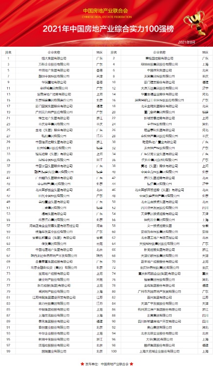 近日,2021年中國房地產(chǎn)業(yè)綜合實力100強(qiáng)排行榜發(fā)布,這是中國房地產(chǎn)業(yè)聯(lián)合會對房地產(chǎn)行業(yè)進(jìn)行全面、科學(xué)、獨立的企業(yè)實力發(fā)展調(diào)查研究宣傳發(fā)布工作。通過對全國34個。▍^(qū)、市)超過3000家利潤總額在1億元至800億元之間的中國房地產(chǎn)開發(fā)企業(yè)進(jìn)行了數(shù)據(jù)采集研究,比照國際上通行的做法,主要根據(jù)營業(yè)收入、資產(chǎn)總額、利潤總額、資信等級、社會貢獻(xiàn)、業(yè)主滿意度等指標(biāo)分析確定候選企業(yè),邀請100位企業(yè)高管、學(xué)者及官員對經(jīng)資格審核符合要求的企業(yè)進(jìn)行綜合評分,并對部分候選企業(yè)進(jìn)行實地拜訪,從中遴選出100家中國房地產(chǎn)業(yè)綜合實力100強(qiáng)企業(yè)。在此基礎(chǔ)上通過與世界500強(qiáng)企業(yè)進(jìn)行綜合對比分析,進(jìn)而有針對性地提出促進(jìn)中國房企做強(qiáng)做大做久的策略建議,在全國范圍內(nèi)形成了巨大的社會影響力。