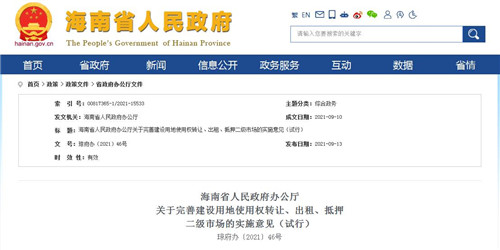 房訊網(wǎng)訊 9月13日,海南省人民政府發(fā)布《海南省人民政府辦公廳關(guān)于完善建設(shè)用地使用權(quán)轉(zhuǎn)讓、出租、抵押二級市場的實(shí)施意見(試行)》的通知,進(jìn)一步健全和規(guī)范全省國有建設(shè)用地二級市場,促進(jìn)存量建設(shè)用地集約高效利用,推進(jìn)海南自由貿(mào)易港建設(shè)。