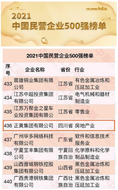 9月25日,由全國工商聯(lián)、湖南省人民政府主辦的2021中國民營企業(yè)500強峰會在湖南長沙隆重召開。此次峰會上,全國工商聯(lián)發(fā)布了《2021中國民營企業(yè)500強榜單及相關調(diào)研分析報告》,正黃集團憑借極具競爭力的發(fā)展前景、穩(wěn)健的經(jīng)營模式、持續(xù)提升的盈利能力再度入榜,位列436位,而在本年度的中國民營企業(yè)500強中,四川省共有8家民營企業(yè)入榜。