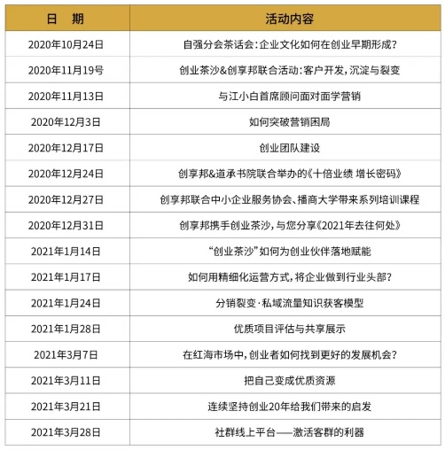 創(chuàng)享邦近期活動(dòng)內(nèi)容如下表: