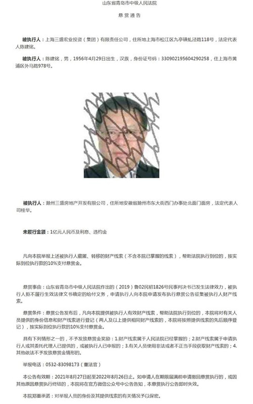 青島市中級人民法院官網(wǎng)截圖通告稱,凡向該院舉報上海三盛、上海三盛法定代表人陳建銘、滁州三盛房地產(chǎn)開發(fā)有限公司,藏匿、轉(zhuǎn)移財產(chǎn)的線索(不含本院已掌握的線索),幫助法院執(zhí)行到位的,按實際到位執(zhí)行款的10%支付懸賞金。該通告有效期至2022年8月26日止。根據(jù)公告,未履行金額為1億元人民幣及利息、違約金。這也意味著提供有效線索并幫助法院執(zhí)行到位的舉報人,最高可獲得1000萬元的懸賞。