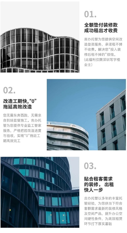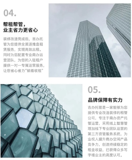 吉辦托管深耕商辦行業(yè)多年,擁有寫字樓從前期租前管理、項(xiàng)目升級改造、租賃管理與后期運(yùn)營管理的豐富經(jīng)驗(yàn),同時(shí)在項(xiàng)目升級改造環(huán)節(jié)擁有一套成熟完善的管理體系,能夠?yàn)閷懽謽菢I(yè)主提供在商辦領(lǐng)域優(yōu)質(zhì)裝修設(shè)計(jì)等團(tuán)隊(duì),及施工品質(zhì)好,性價(jià)比高的供應(yīng)商等參考方案。既能幫助業(yè)主完成商辦空間裝修改造,又能實(shí)現(xiàn)快速出租,以及提供后期的托管運(yùn)營服務(wù)。