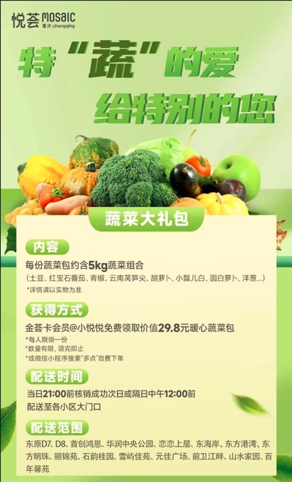 近日,我市市民面對(duì)這場(chǎng)突如其來(lái)的疫情,完全來(lái)不及儲(chǔ)存足量的新鮮蔬菜,“買菜”成了一大難題。為解決大家疫情當(dāng)下的燃眉之急,重慶悅薈購(gòu)物中心為項(xiàng)目金薈卡會(huì)員免費(fèi)送上了愛心蔬菜包。
