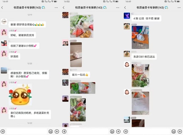 “菜很新鮮,感謝悅薈!”“蔬菜包已收到,感謝感謝”“收到了,感謝商場(chǎng)的愛”……收到蔬菜包后,大家在群里紛紛拍照刷屏,花式“曬菜”。