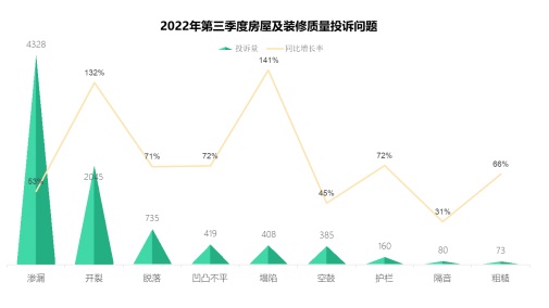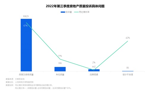 本季度質(zhì)量投訴中房屋及裝修質(zhì)量相關(guān)投訴10829起,較去年同期增長67%;車位質(zhì)量相關(guān)投訴916起,較去年同期增長17%;違章搭建、設(shè)計不合理相關(guān)投訴分別為442起、85起。