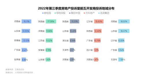 從地域分布來看,2022年第三季度河南省、陜西省、山東省、河北省、安徽省投訴量居前五,其中山東省房地產(chǎn)投訴量較去年同期增長111.21%,連續(xù)三個季度投訴總量較去年同期翻倍。