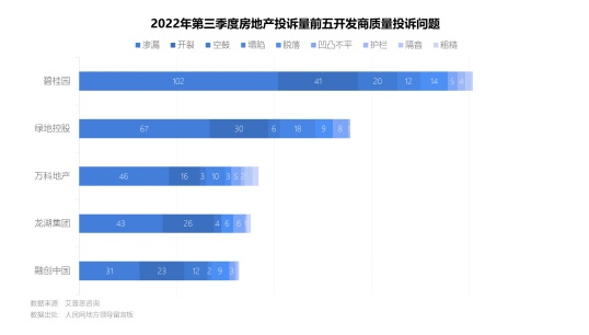 本季度投訴量前五開發(fā)商質(zhì)量投訴具體問題中,滲漏、開裂仍為主要問題,碧桂園收到滲漏相關(guān)投訴102起、開裂相關(guān)投訴41起,綠地控股收到的滲漏、開裂相關(guān)投訴分別為67起、30起;此外,碧桂園收到的空鼓、塌陷、脫落相關(guān)投訴均在10起以上。